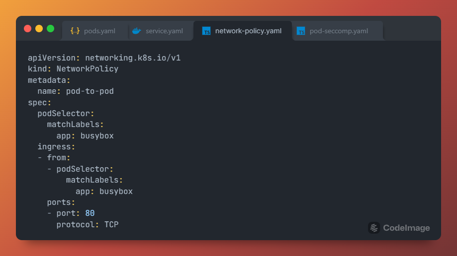 Note that the curl request will fail if the network policy is working correctly because it only allows communication between the client pod and the server pod on port 80. By restricting pod-to-pod communication in this way, you can significantly improve the security of your Kubernetes cluster.