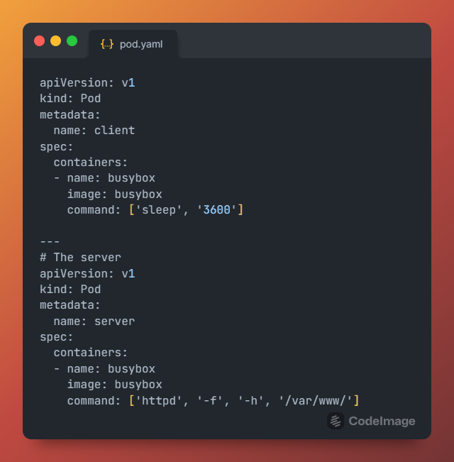 client) will be used to send a curl request, and the second pod (server) will run anhttpdserver to serve HTML files.