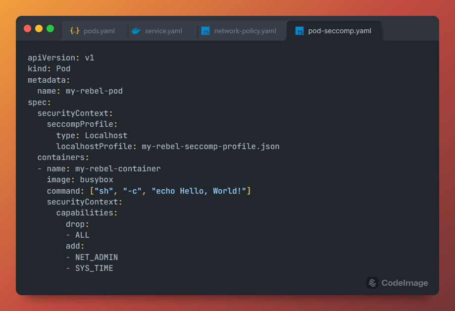 Finally, we've enabled Linux capabilities whitelisting by including another securityContext section with a "capabilities" sub-section. We've dropped all capabilities using the "drop" field and then whitelisted the "NET_ADMIN" and "SYS_TIME" capabilities using the "add" field. This means that the container will only have access to the whitelisted capabilities and all other capabilities will be dropped.