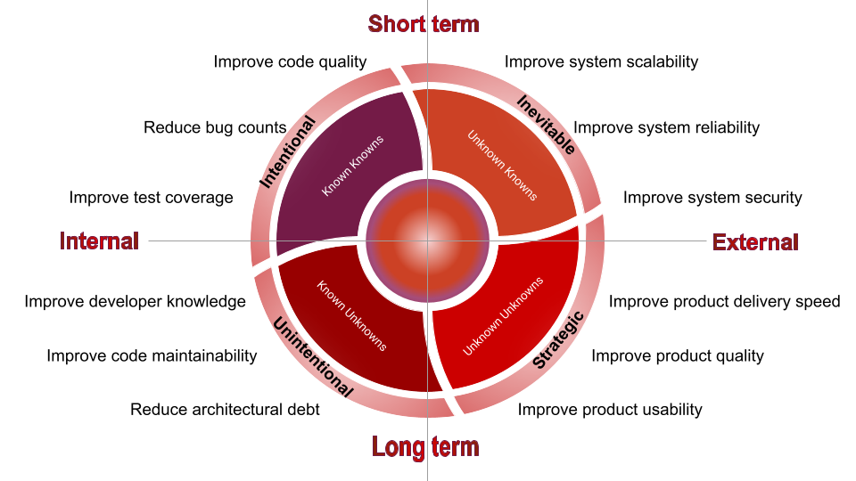 Unknown Knowns or Inevitable Debt: This quadrant encompasses inevitable technical debt stemming from external factors like changing technologies or regulations. To manage this, teams must stay vigilant and adaptable. By staying informed about industry trends, attending conferences, and fostering a culture of experimentation, teams can anticipate and prepare for inevitable debt, minimizing its impact on project progress.